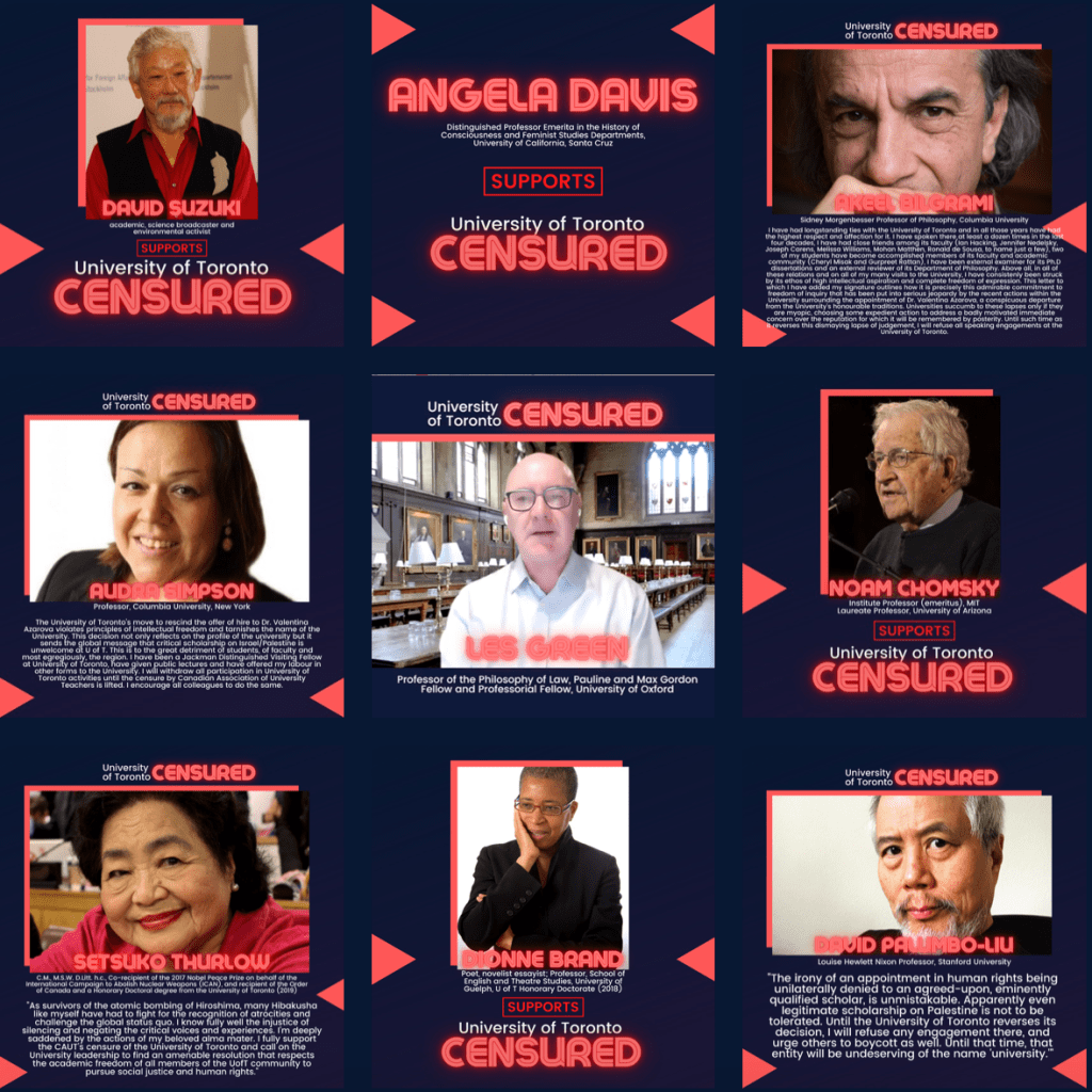 On October 21, CensureUofT hosted CAN’T STOP, WON’T STOP with special guests: Nahla Abdo, Nick Estes, Fred Moten, Ananya Roy & David Robinson, to celebrate and reflect on the campaign, and map the work ahead on donor power, collegial governance, and the Palestine exception in higher education. Watch the recording here: