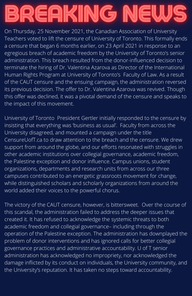 AS OF FRIDAY SEPTEMBER 17, 2021, THE CAUT CENSURE OF THE UNIVERSITY OF TORONTO IS ON “PAUSE“! This is an enormous victory and we are deeply grateful to all of you whose support made this possible. The victory is partial, however, and so the work continues. Watch our short video message below and read the statement here.